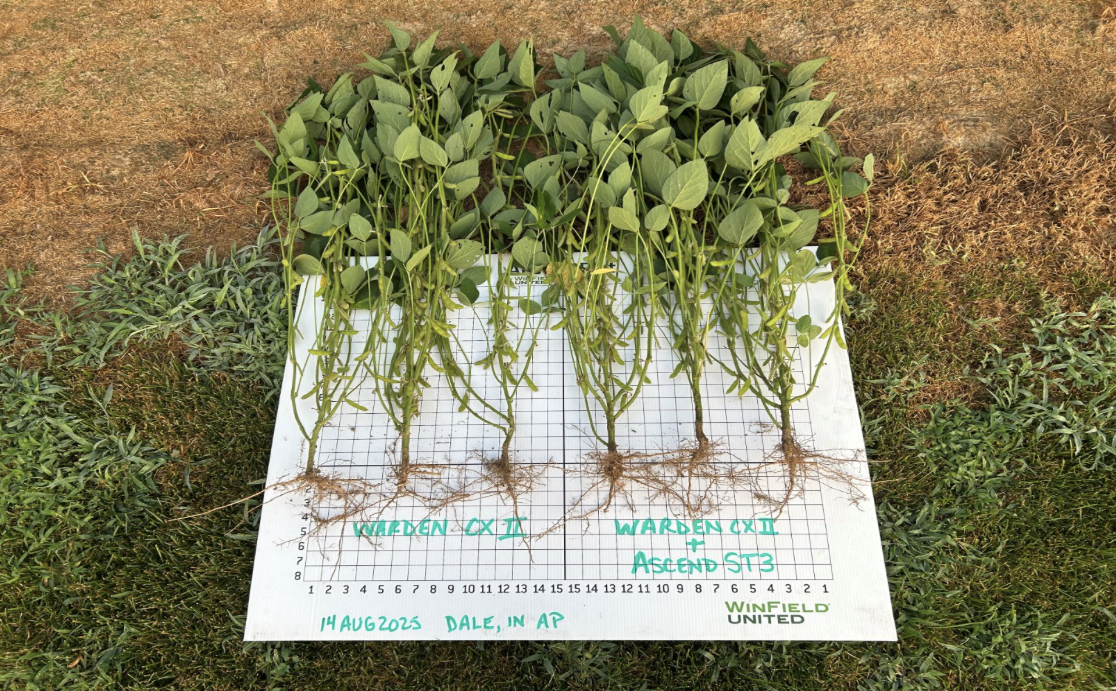 Warden CX II seed treatment alone vs. Warden CX II + Ascend ST3 PGR Dale, IN Answer Plot, 2025 |