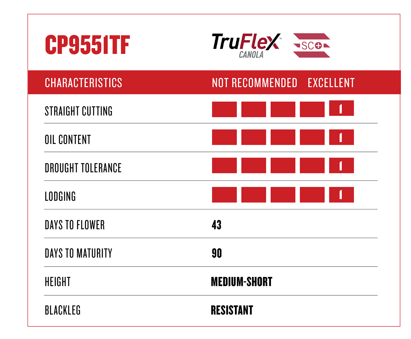 CP9551TF canola is a medium-to-short, 90-day maturity plant that features great standability and high yield potential. Strong vigor and early flowering help it fit environments spanning from North Dakota and Montana to the Pacific Northwest.