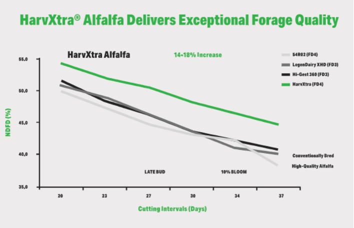 - Continue to harvest at a 28-day window. Our research has shown a 14-20% increase in neutral detergent fiber digestibility (NDFd).1 For example, most dairy producers or hay growers selling to dairies seek higher quality feed that offers improved digestibility. In that case, HarvXtra Alfalfa may be a good choice to enhance the forage’s nutritional value.